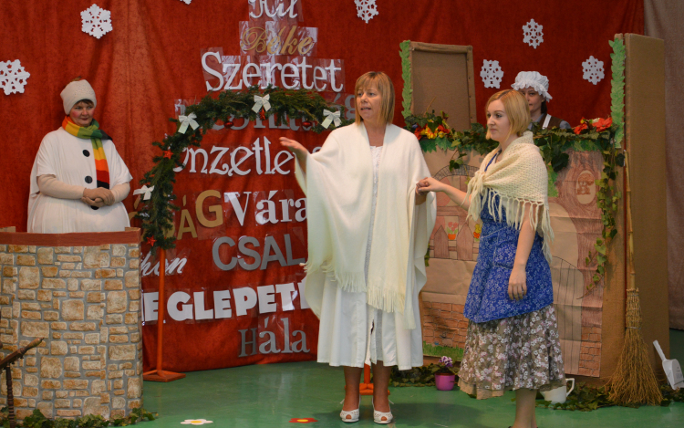 Grimm egyik legszebb meséjét, a Holle anyót varázsolták színpadra az előadók szemet-szívet elkápráztató módon. A csodálatos táncbetét és a fülbemászó dallamok, csakúgy mint a szereplők gesztusai mind-mind arról tettek tanúbizonyságot, hogy nagyon sok munka, gyakorlás rejtőzik mögötte. A közel hatvan gyermek és majd harminc felnőtt közreműködésével bemutatott darabbal, verssel és dallal színesített műsorral a legnagyobb ajándékot adták közönségüknek az iskola képviseletében fellépett előadók. Azt, hogy egy pillanatra megszűnhetett a zajos, rohanó külvilág és átélhettük a szeretet, az ünnep melegségének édes varázsát.