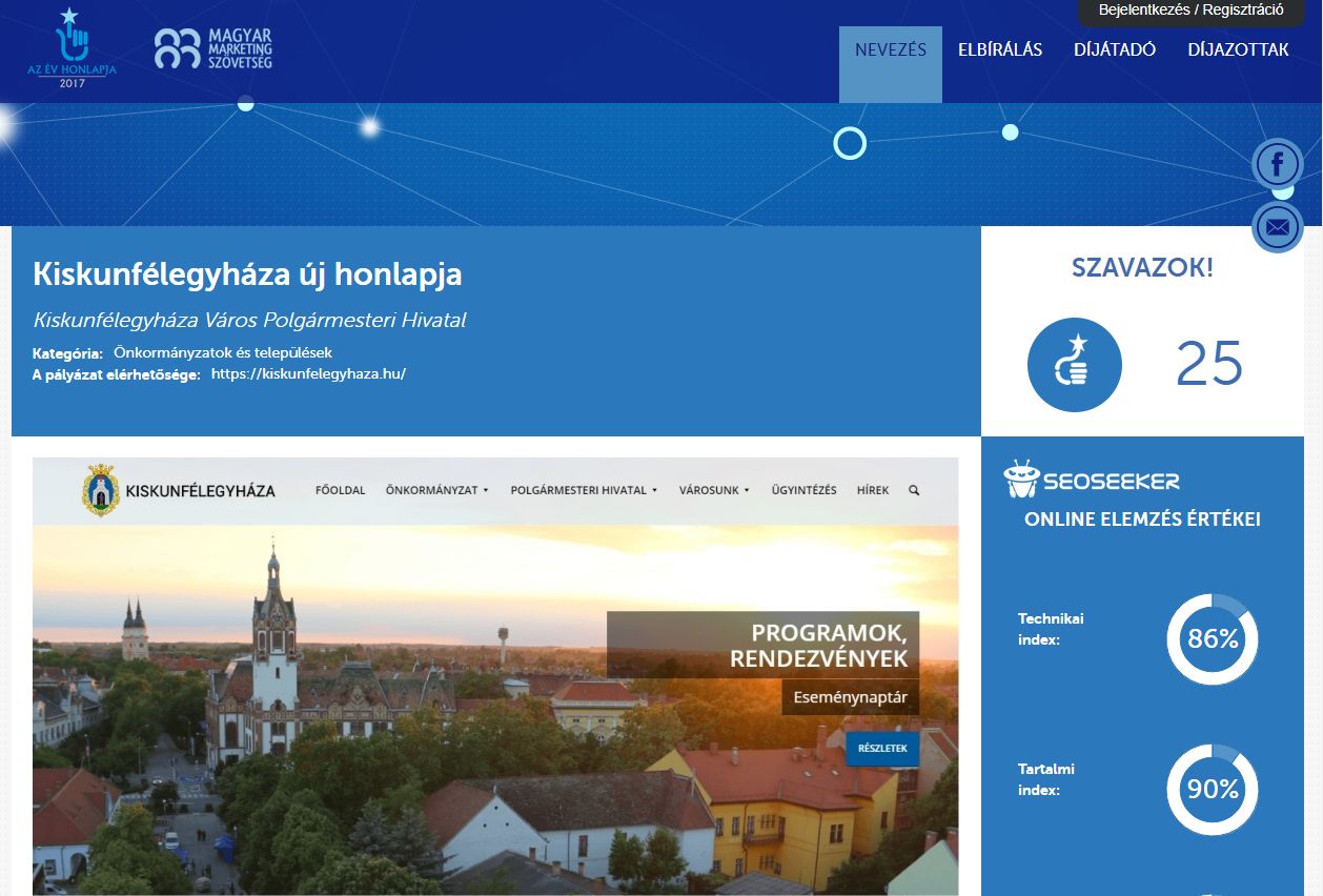 A verseny minden évben nagy. Annyi már most látható az automatikus értékelőrendszer alapján, hogy a meghatározott paraméterek alapján messze az átlag felett szerepel a www.kiskunfelegyhaza.hu. Most már csak arra van szükség, hogy minél többen segítsék szavazatukkal a honlap jó helyezését. Ezért arra kérjük ezúton is a félegyháziakat, hogy szavazzanak a város honlapjára, ha pedig megtették – mindenki egy szavazatot adhat le – hívják fel rokonaik, barátaik, ismerőseik figyelmét a lehetőségre, akár e cikk megosztásával is.