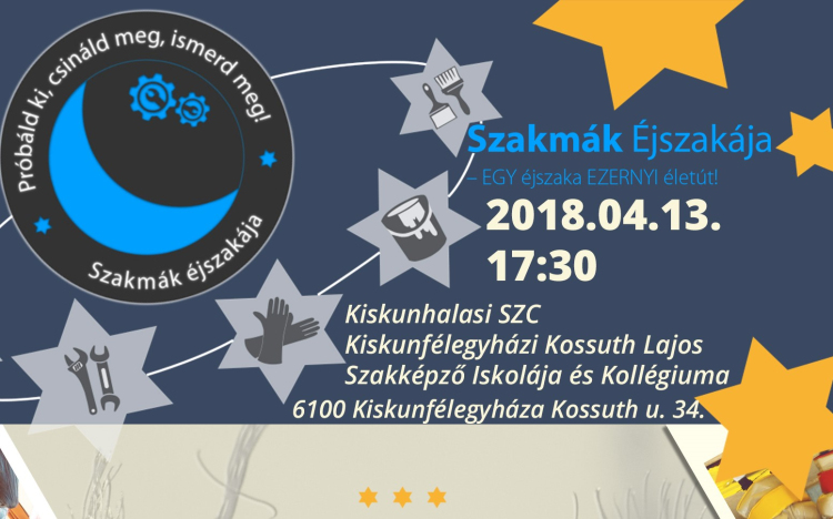 A Kiskunhalasi SZC Kiskunfélegyházi Kossuth Lajos Szakképző Iskolája és Kollégiuma április 13-án 17:30 órai kezdettel Szakmák Éjszakájára várja az érdeklődőket.