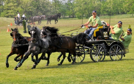 Délután: 14.00 órától izgalmas, látványos kombinációs versenyben mérik össze tudásukat a kettes és négyesfogatok. Láthatjuk Őket terepjárót vezetni, kerékpározni és természetesen négyesfogatot hajtani. Világbajnokokkal startnál Dobrovicz József és ifj. Dobrovicz József, Juhász László, ifj. Juhász László.
