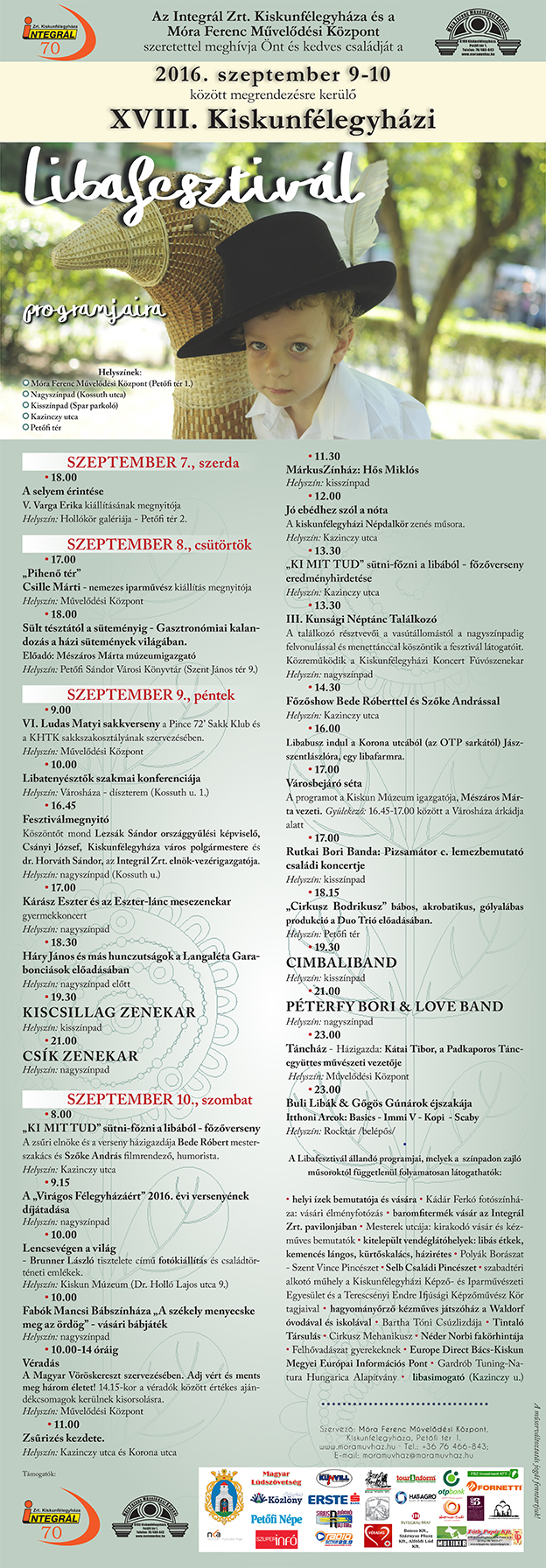 Az Integrál Zrt. Kiskunfélegyháza és a Móra Ferenc Művelődési Központ szeretettel meghívja Önt és kedves családját a 2016. szeptember 9-10 között megrendezésre kerülő XVIII. Kiskunfélegyházi Libafesztivál programjaira.