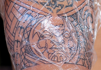 - Miután hazaértél a szalonból, távolítsd el a fóliát amivel lefedték a frissen készült tetoválásodat, hiszen ez csak arra szolgál, hogy megvédje a portól és egyéb szennyeződésektől, viszont hosszú távon nem engedi szellőzni.