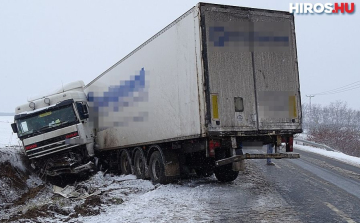 Egy kamion sodródott az útszéli árokba a havas úton Kiskunfélegyháza elkerülő szakaszán.