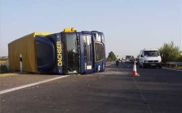 Egy kamion felborult az M5-ös autópálya Szeged felé tartó oldalán Kecskemét és Kiskunfélegyháza között hétfő reggel, két ember megsérült.