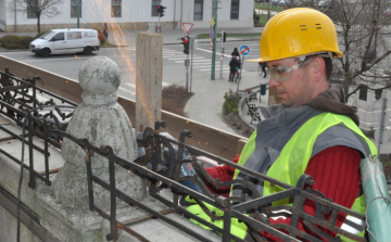 Elkezdődött a Városháza erkélyének bontása. A fém virágtartók eltávolítása után a szakemberek leemelik helyéről a mellvéd elemeit