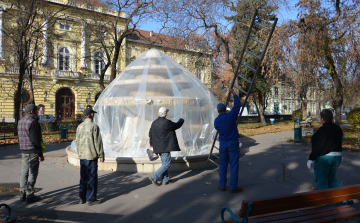 Ma (november 17-én) a Petőfi téri szökőkút befóliázásával kezdődtek meg a munkálatok a téli fagyok elleni védelem területén.