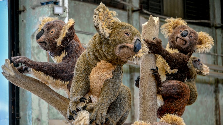 Hungarocellből formázott koalákat ábrázoló kompozíció a Debreceni Virágkarneválra készülő kocsikat bemutató sajtótájékoztató előtt Debrecenben 2020. augusztus 13-án (Fotó: MTI/Czeglédi Zsolt)