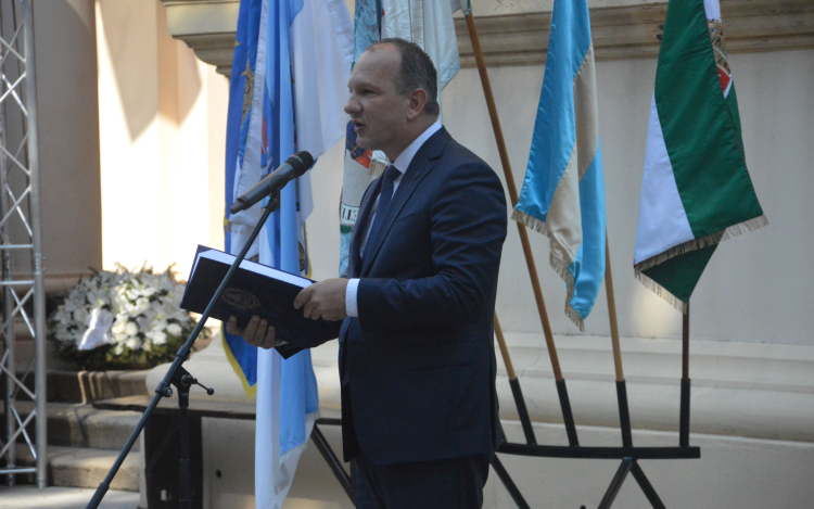 Nekünk, félegyháziak, a mai időkben a leeresztett kardú Szent Istvánról kell példát vennünk, aki most a nyugalmat a békességet állítja szembe a dübörgő nyugtalansággal. Mi, XXI. századi félegyháziak, elsősorban az egymás közti megértés, békesség és nyugalom érdekében tehetünk valamit mindennapjainkban. Az egymás közti kapcsolatokban egy mosolygós gesztussal, kicsi udvariassággal is megadhatunk egy nyugodt alaphangot, mert valamennyien látjuk, érezzük, hogy mindennapjainkat áthatja a békétlenség – mondta beszédében Csányi József polgármester, majd összefogást, békességet, szeretetteljes lelki épülést kívánt a városlakóknak Szent István ünnepén.
