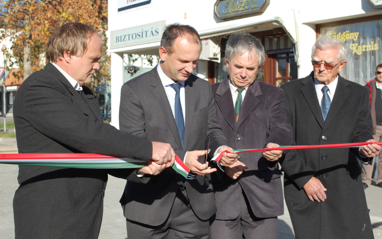 Nemrég még gépeket és szorgos embereket láthattuk munkálkodni a környékben, a mai napon pedig Csányi József polgármester, Balla László alpolgármester, Bense Zoltán a választókerület önkormányzati képviselője és Seres József, a kivitelező cég ügyvezetője vágta át a nemzeti színű szalagot a megújult sétálóutcán.