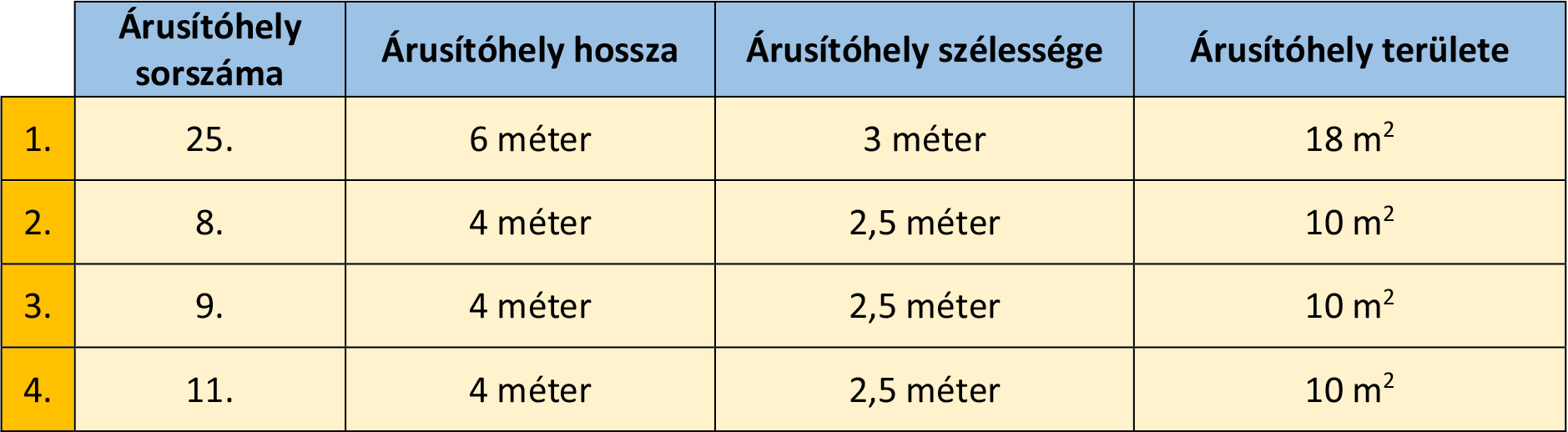 Az árusító helyek elhelyezkedését a Piacfelügyelet irodájánál, a hirdetőtáblán kihelyezett térképen lehet megtekinteni.