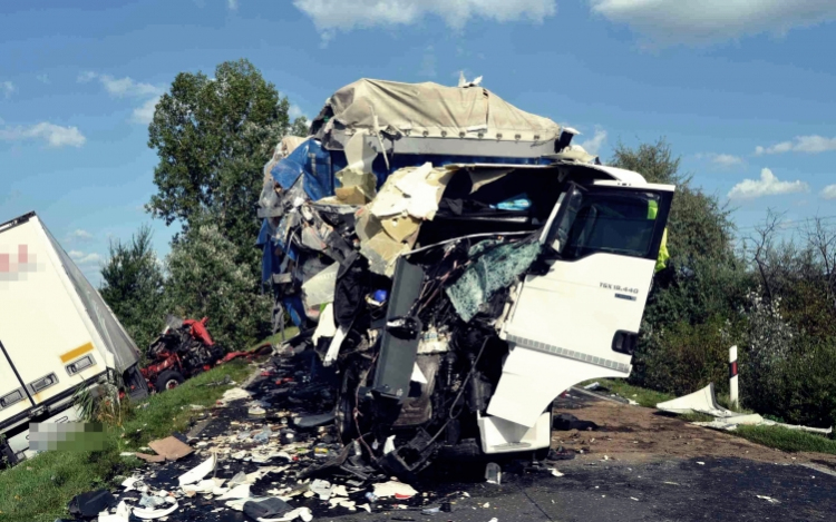Egy autó fedélzeti kamerája felvette, ahogy két kamion frontálisan ütközött össze Kecskemét közelében.