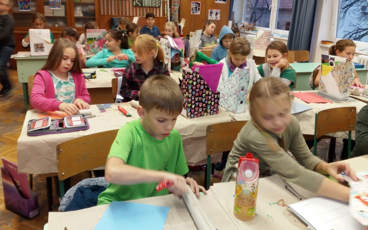 Délután az alsó évfolyamosok újrahasznosított alapanyagokból kézműveskedtek. Ennek eredményeként WC gurigából, műanyagkupakokból sok szép hóember, sárkány, kasztanyetta és karkötő készült el.