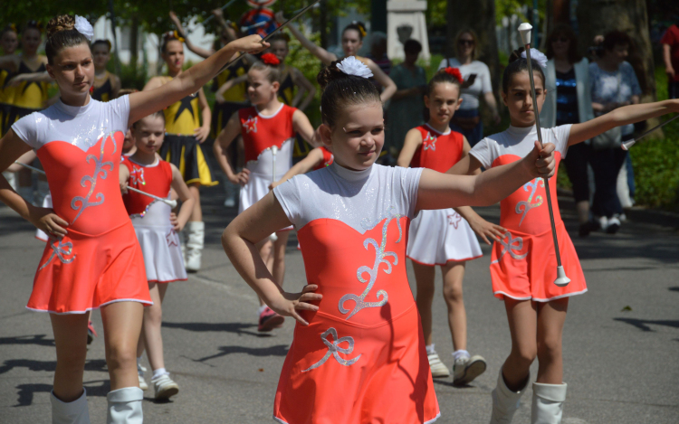 A csillogó ruhákban menetelő és táncoló tizenkét mazsorett csoportot a Kiskunfélegyházi Koncert Fúvószenekar és a Kiskunmajsai Ifjúsági Fúvószenekar kísérte végig a „ligetös” fasoron.
