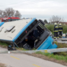 Egy menetrend szerint közlekedő busszal karambolozott egy utánfutót vontató személyautó az 54-es főút 43-as kilométerénél, a Bács-Kiskun megyei Soltvadkert határában, a Bócsa felé vezető szakaszon. Az ütközés következtében a busz az árokba borult. Elsődleges adatok szerint a buszon 5 ember megsérült, míg a személyautóban egy fő a helyszínen meghalt. A műszaki mentést a soltvadkerti önkormányzati tűzoltók végzik. A balesethez riasztották a kiskőrösi és a kiskunhalasi hivatásos tűzoltókat, továbbá a katasztrófavédelem műveleti szolgálatát is. Az érintett szakaszt a mentés idejére lezárták.