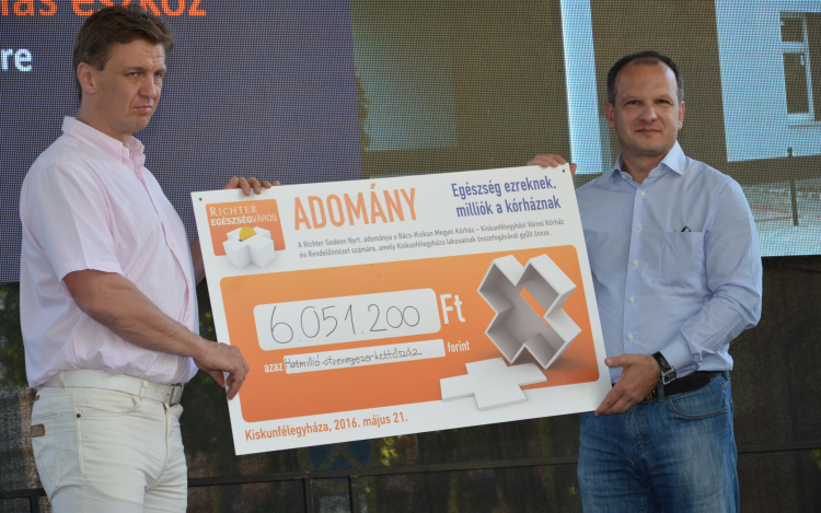 Az összefogásnak és a Richter Egészségváros szűrőprogramjain való aktív részvételnek köszönhetően a reggel 9-től 17 óráig tartó pontgyűjtést követően dr. Körtvélyessy András, a városi kórház és rendelőintézet főigazgató-helyettese és Csányi József polgármester több mint 6 millió forintos adományt vehetett át.