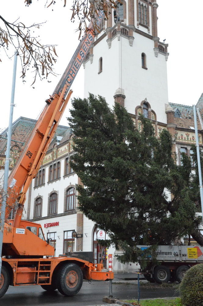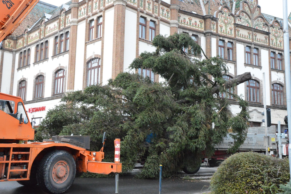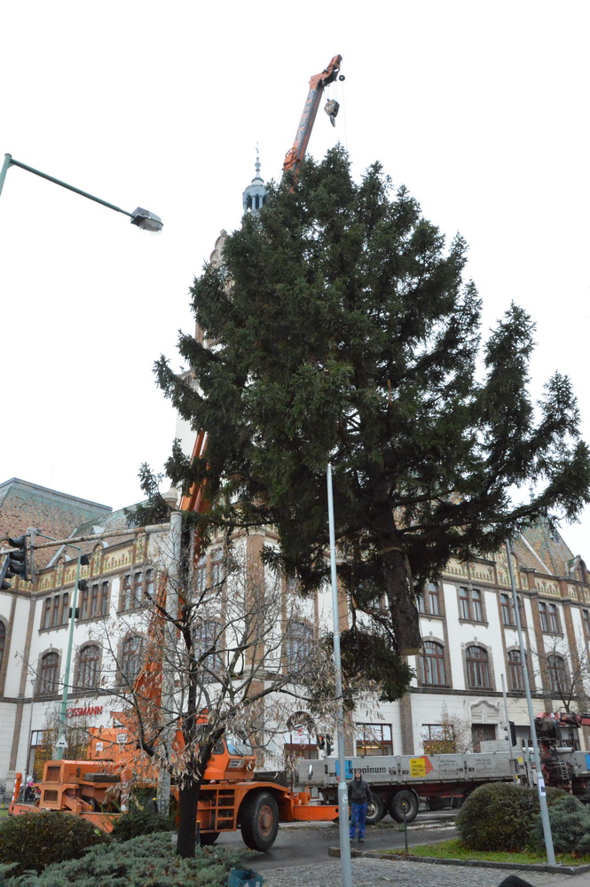 A hatalmas fenyőt állítottak fel ma (december 3-án) a Petőfi téren, melyre a nap folyamán 5000 led és több száz dísz kerül.