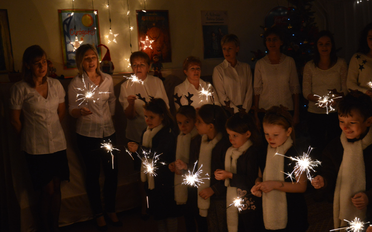 A zene mellett a mesés játék is helyet kapott a Manócska csoport gyermekeinek előadásában, akik rénszarvas agancsokkal és pirosra festett orrocskával adták elő táncocskájukat a közönségnek. A megérdemelt taps után mind az óvónők, mind pedig a fellépő gyerekek csillagszóróval köszöntötték karácsony ünnepét. A villanyoltás után csak a szikrázó csillagocskák világították be a helyiséget, s ez oly meghitté és varázslatossá tette az estét, hogy szinte úgy érezték a jelenlévők, tényleg Karácsony este van.