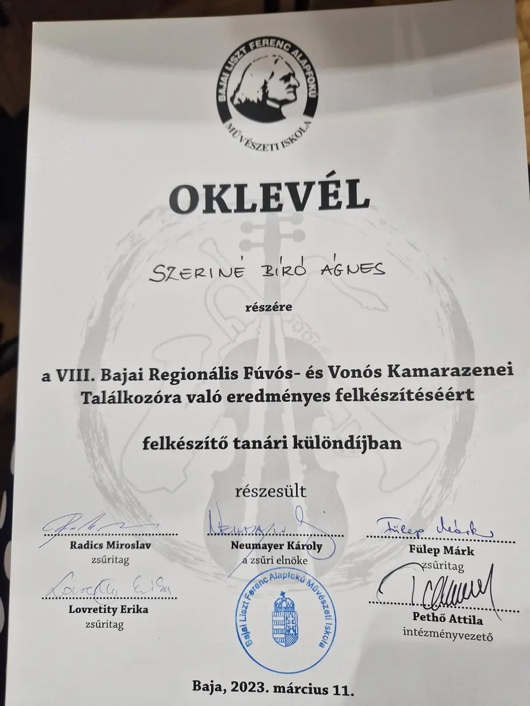 A három Batthyánys tanuló: Csőke Csenge 6.a, Ördögh Szilárd 7.z, Varga Judit 8.a és Pesír Dorina kimagasló előadással megszerezték a rangos zsűri kiemelt arany és a tisztán vonós kategóriában a kategória győztes díjakat. Szeriné Bíró Ágnes felkészítő tanári különdíjban részesült.
