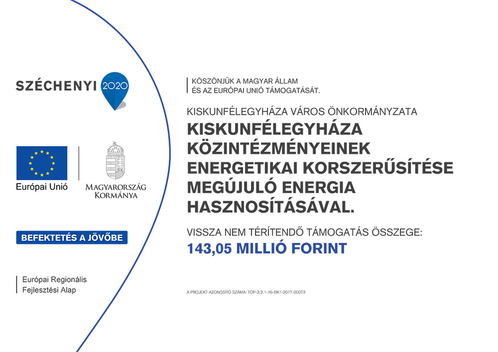 ATOP-3.2.1-16-BK1-2017-00073azonosítószámú„Kiskunfélegyháza közintézményeinek energetikai korszerűsítése megújuló energia hasznosításával”című projekt esetében a támogatás összege:143.047.207 Forint.