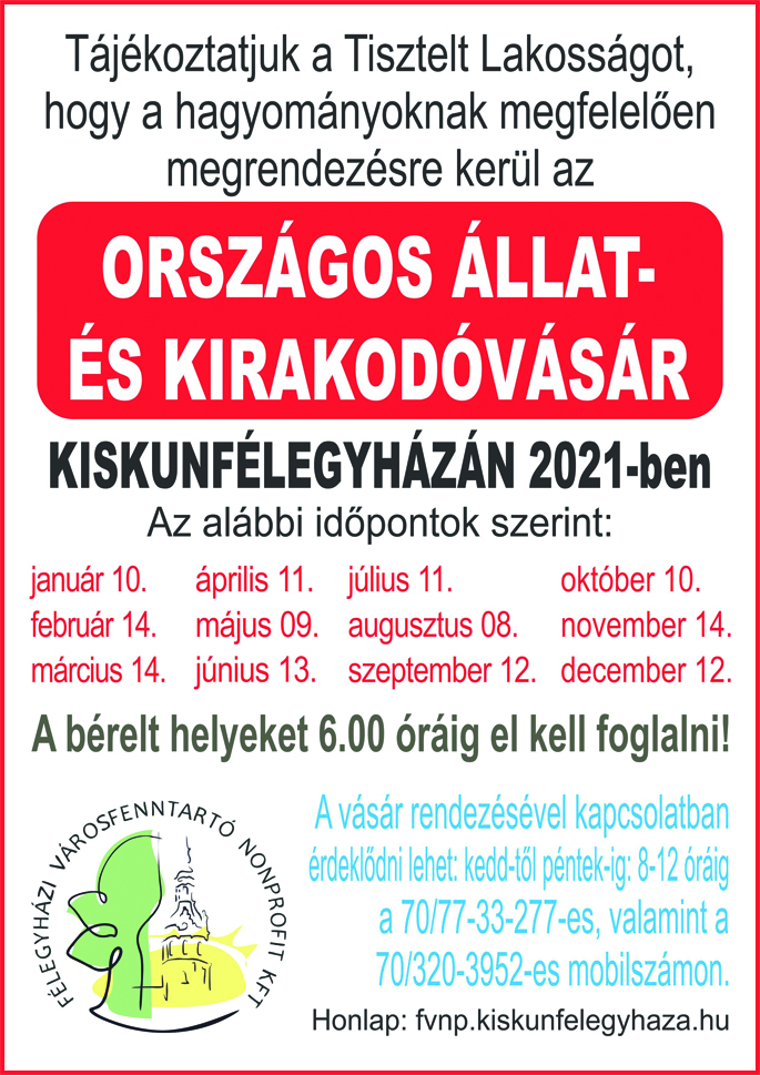 Félegyházi Városfenntartó Nonprofit Kft. Piac- és Vásárüzemeltetési részlege tájékoztatja a vásárlókat és az árusokat, hogy a Kiskunfélegyházi Országos Állat és Kirakodó vásár időpontja: 2025. december 14. (vasárnap).