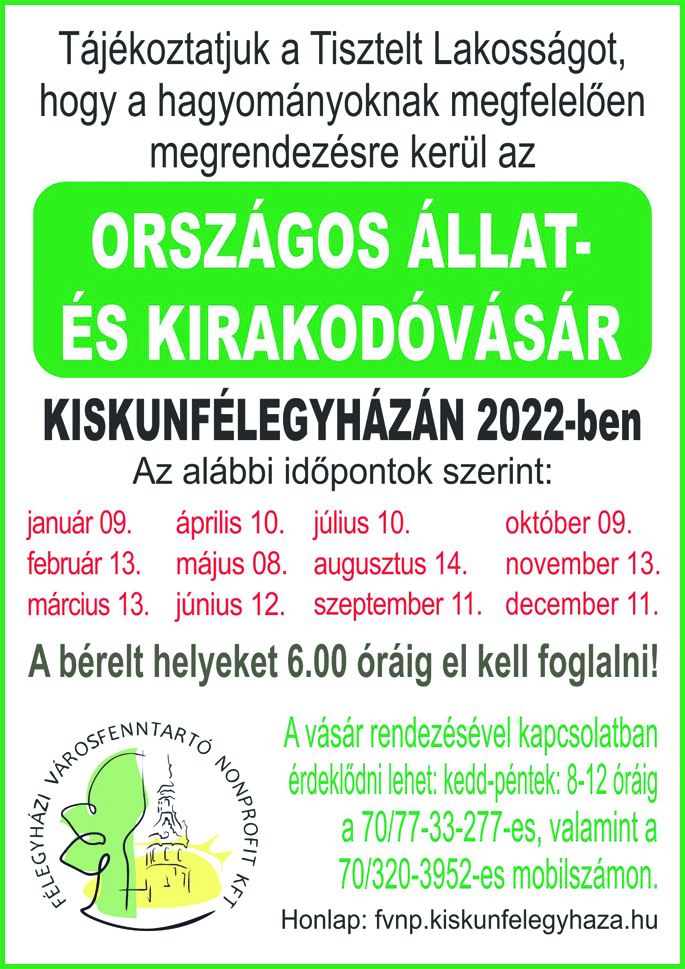 2022-ben a hagyományoknak megfelelően minden hónap második vasárnapján Országos Állat- és Kirakodóvásárt tartanak Kiskunfélegyházán.