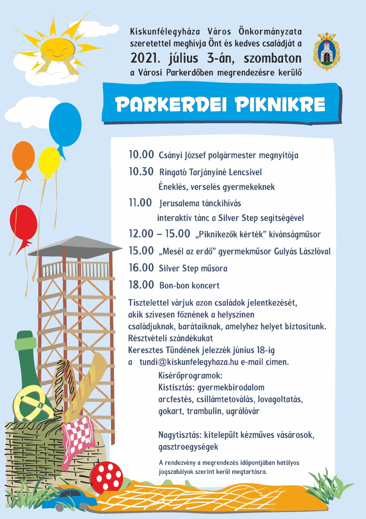 Kiskunfélegyháza Város Önkormányzata szeretettel meghívja Önt és kedves családját 2021. július 3-án, szombaton 10 órától a Városi Parkerdőben megrendezésre kerülő Parkerdei Piknikre.