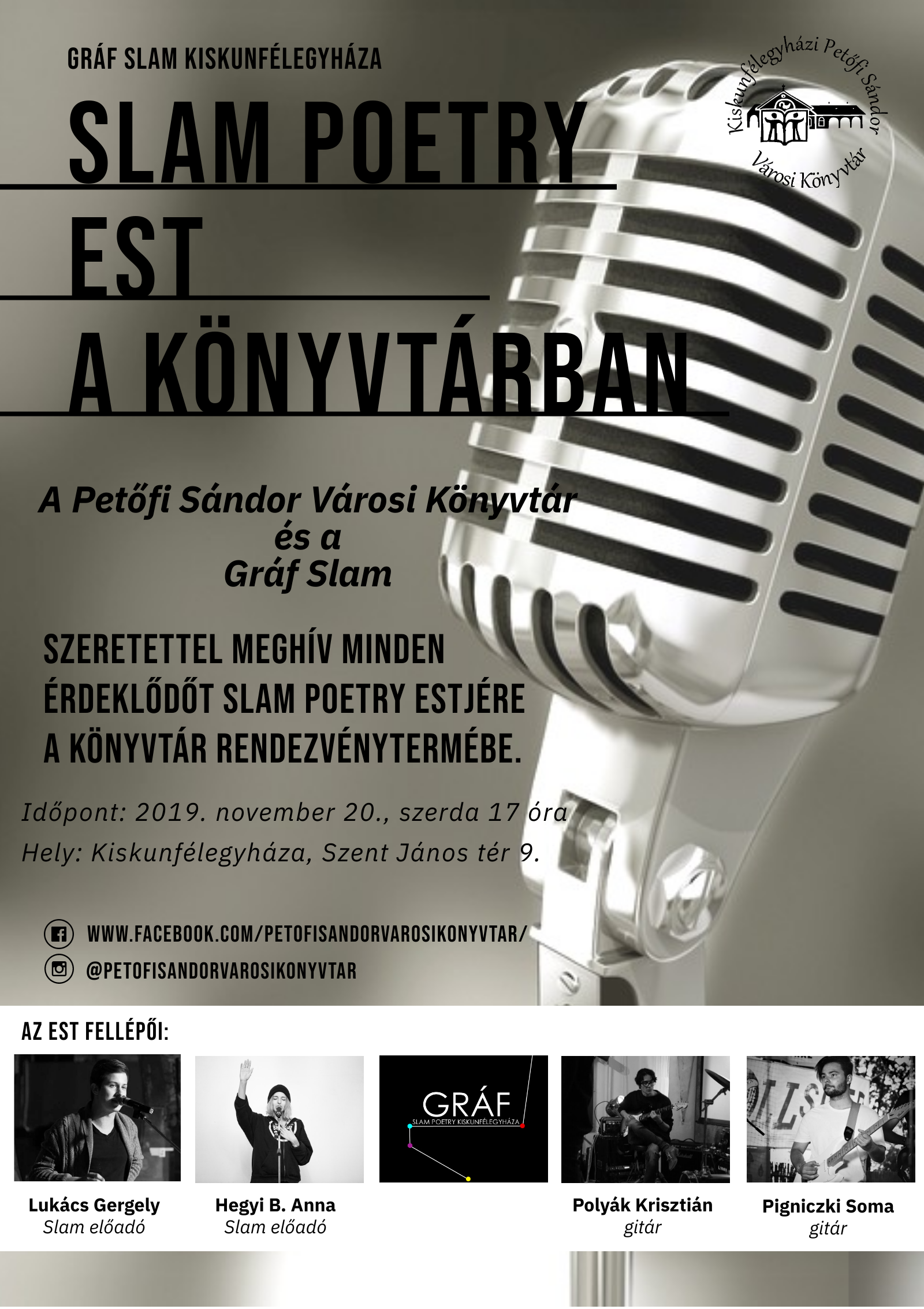 A Petőfi Sándor Városi Könyvtár és a Gráf Slam szeretettel meghív minden érdeklődőt Slam Poetry Estjére a könyvtár rendezvénytermébe.