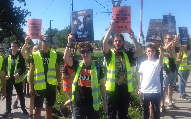 Ma (július 10-én) transzparensekkel vonultak fel a Hungary Animal Save Mozgalom aktivistái a kiskunfélegyházi Hungary-Meat vágóhíd előtt.